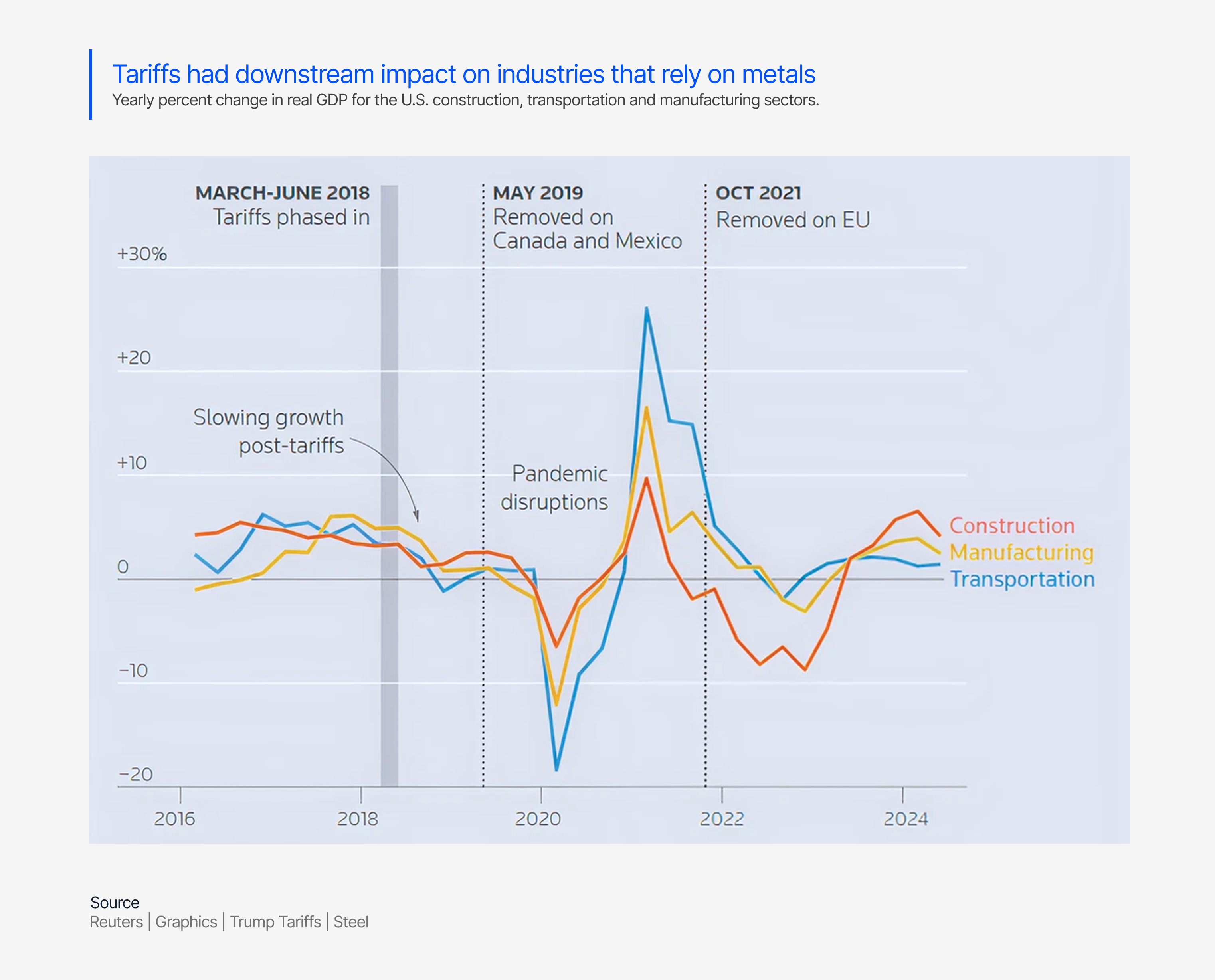 Recent history provides its own cautionary tale. When tariffs were imposed on furniture, appliances, and steel in 2018, domestic production in those sectors didn’t surge—it declined. The logic of revitalizing industry through protectionism failed to materialize, as producers faced rising input costs and disrupted supply chains. Rather than curing industrial decline, tariffs appeared to accelerate it.